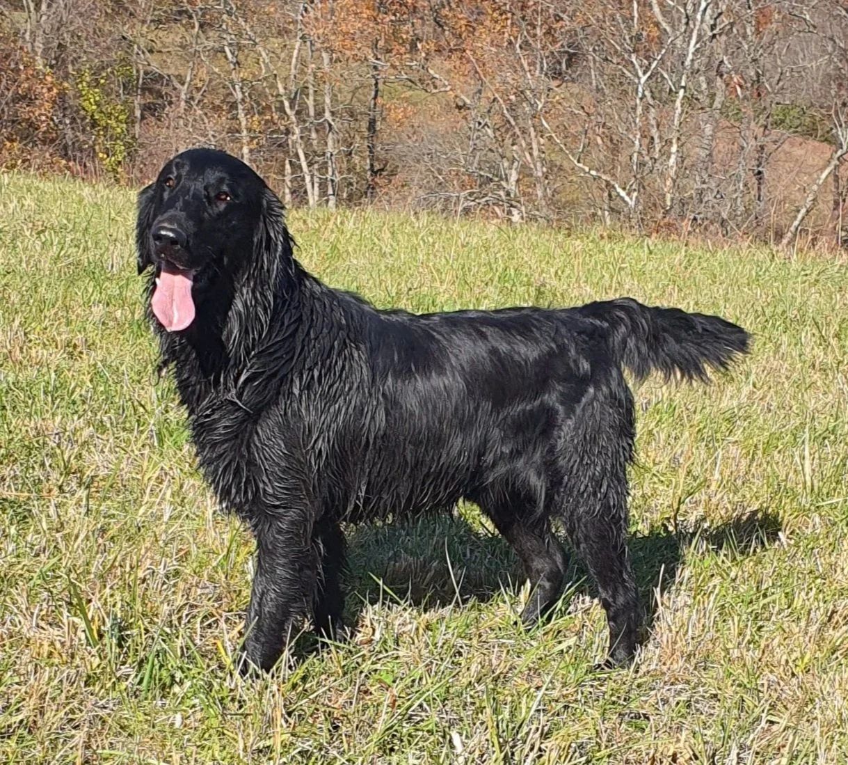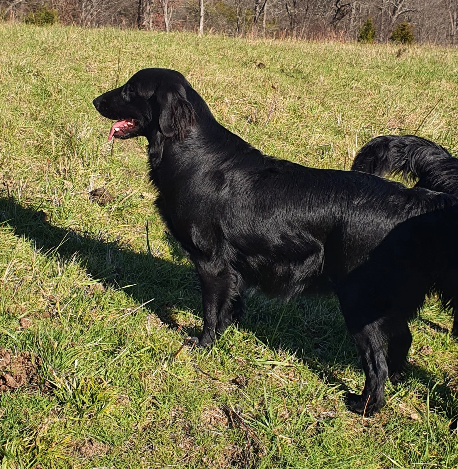 Eriss is a purebred Flat Coat Retriever. Imported from Ireland, Eriss comes from five generations of champion bloodline pedigree. She is very sweet, intelligent loves to play fetch and is incredibly sweet. Much like Ester, her confirmation is excellent for producing strong pups excellent for sport companionship and delightful family dogs.