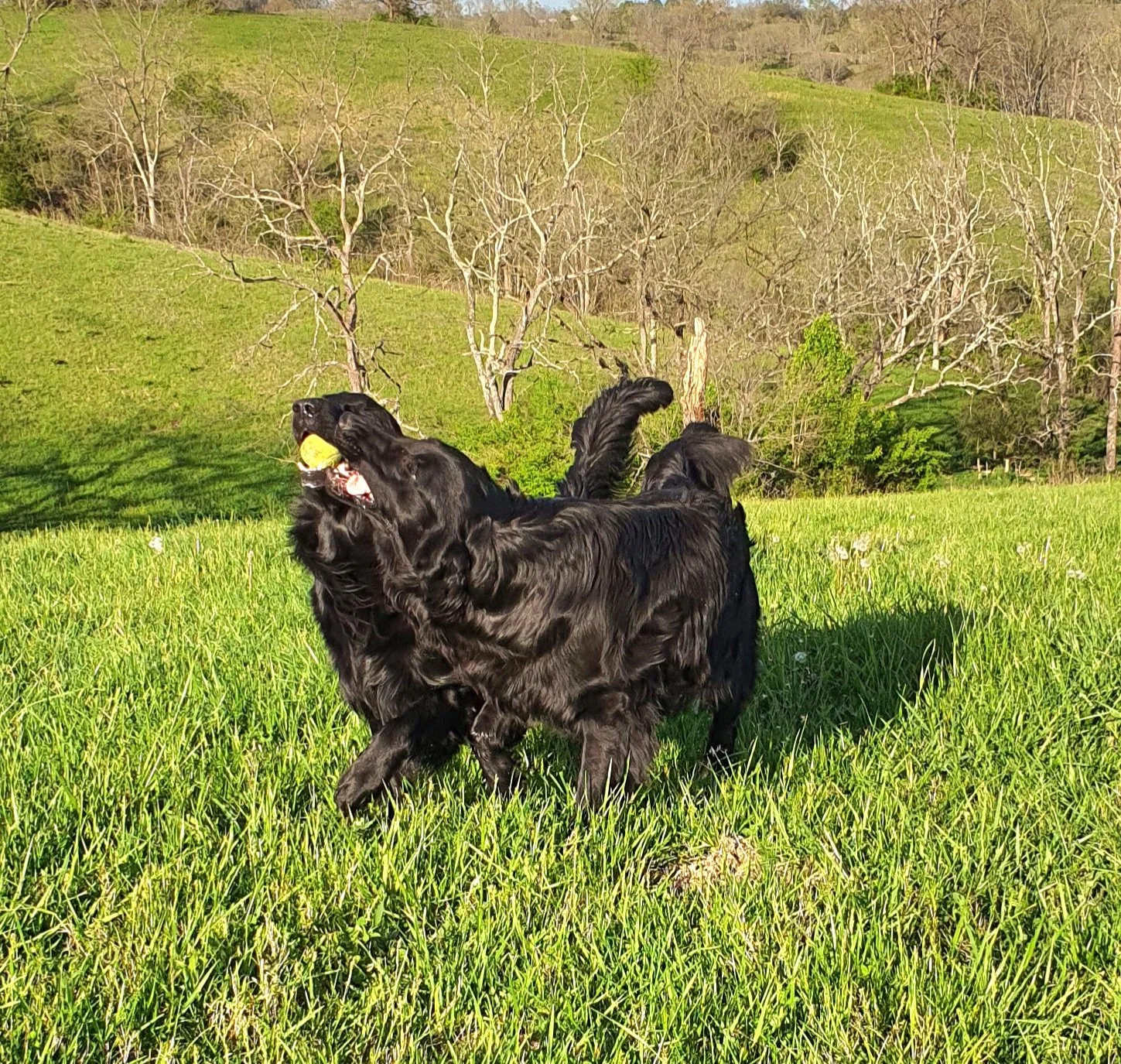 Our Flats and Goldens enjoy the company of our extended family of horses and cats.
